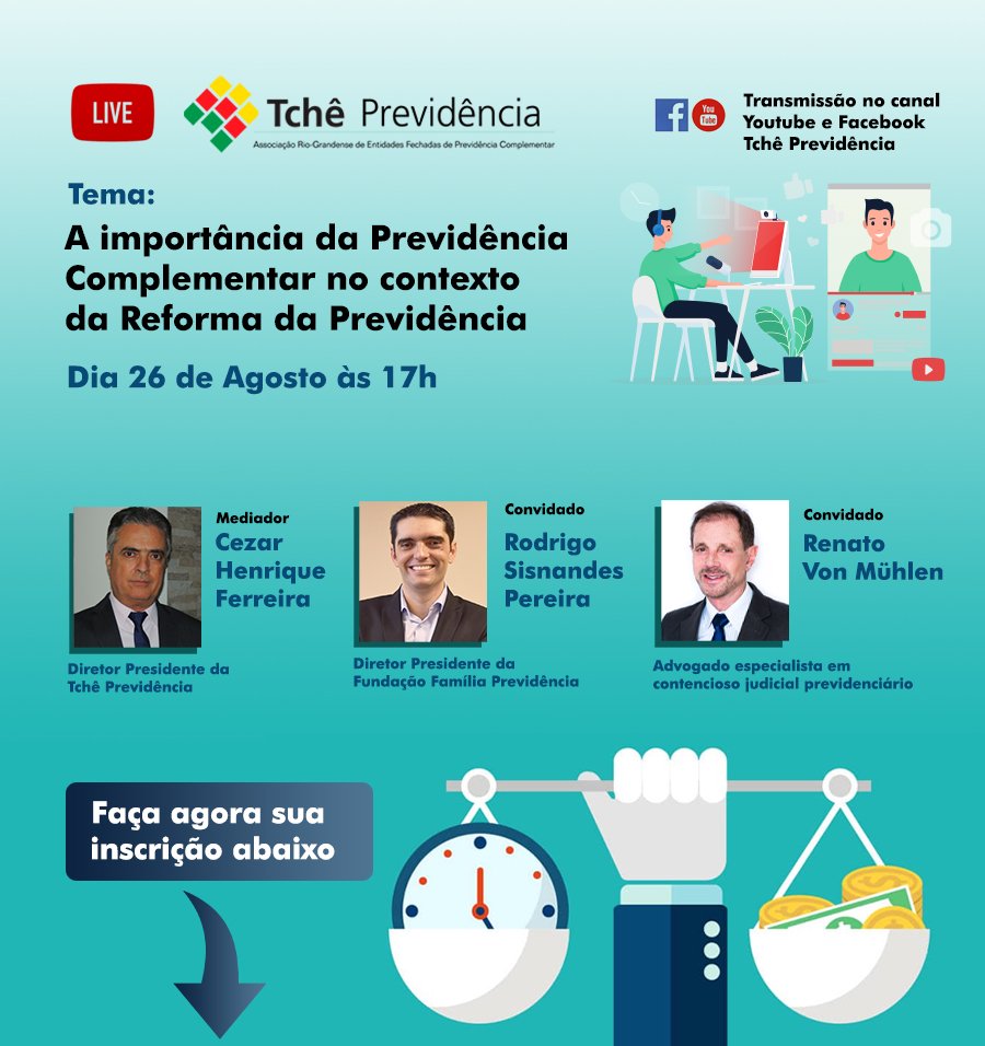 Eventos14 de agosto de 2020 26 de Agosto – 2ª Live Tchê Previdência 26/08/2020 às 17hsAo vivo pelos canais da Tchê Previdência no YouTube e no Facebook Inscreva-se para receber o link de acesso a transmissão Seu nome (obrigatório) Seu e-mail (obrigatório) Celular Empresa Cargo 55193Δ