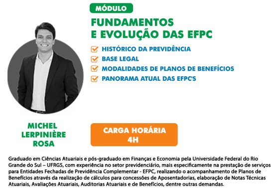 Tópicos do módulo: Histórico da Previdência; Base Legal; Modalidades de Planos de Benefícios; Panorama atual das EFPC’s.
