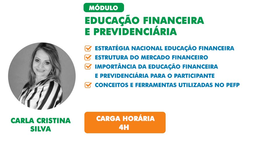 Tópicos do módulo: Estratégia Nacional educação financeira; Estrutura do Mercado Financeiro; Importância da Educação Financeira e Previdenciária para o participante;