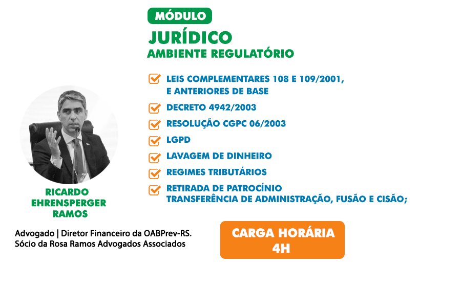 Tópicos do módulo: Leis Complementares 108 e 109/2001 e anteriores de base; Decreto 4942/2003; Resolução CGPC 06/2003; LGPD; Lavagem de Dinheiro; Regimes Tributários; Retirada de Patrocínio, Transferência de administração; Fusão e Cisão;