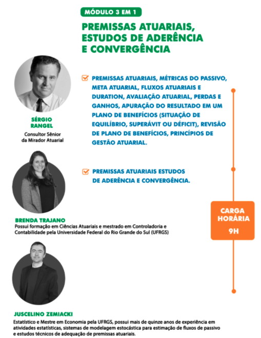 Tópicos do módulo: Premissas Atuariais; Estudos de Aderência e Convergência. Fluxos Atuariais e Duração do Passivo, Equilíbrio do plano de benefícios, superávit ou déficit, Solvência, Gestão de Risco Atuarial